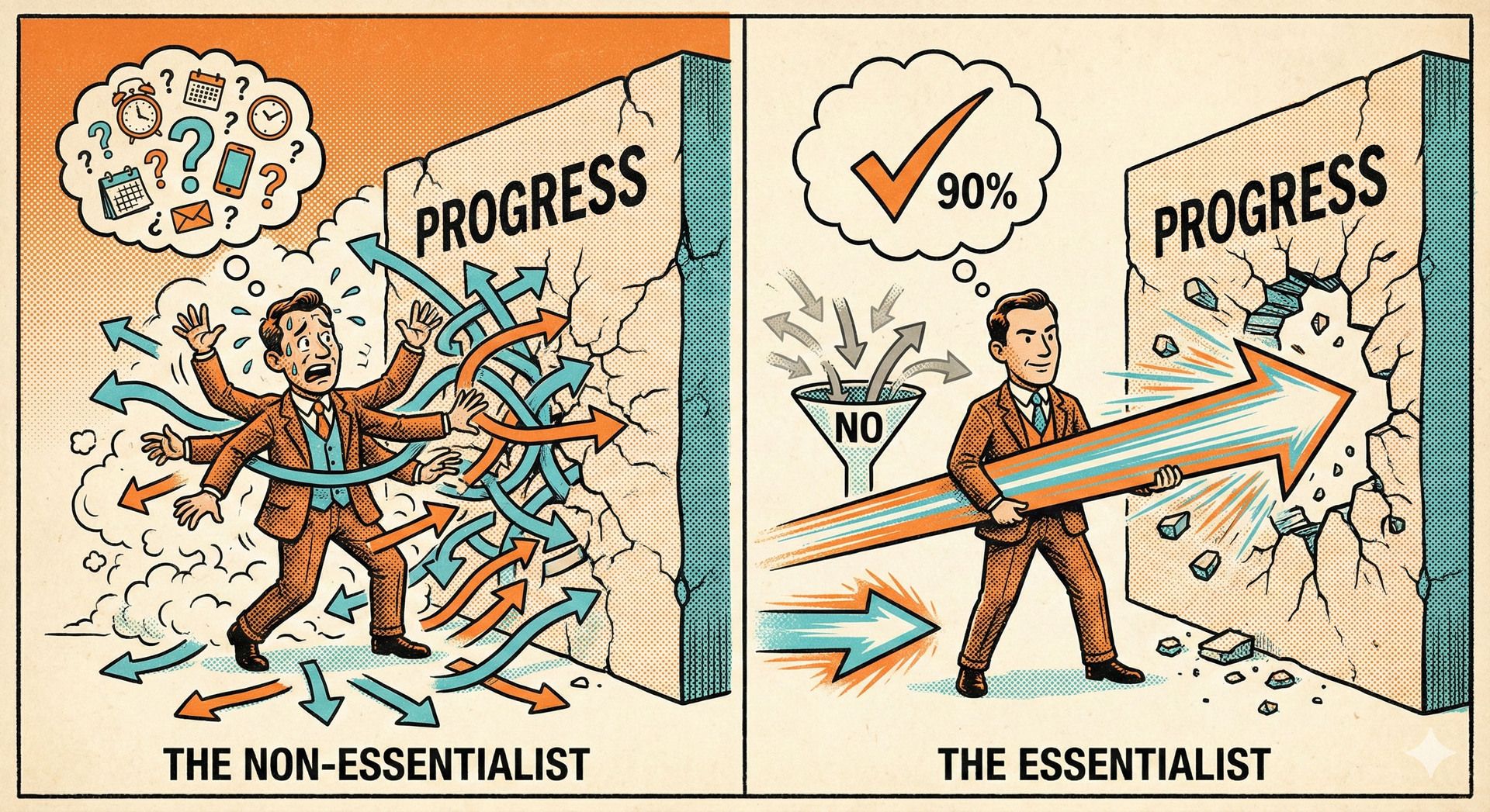 The central lesson of Essentialism is a matter of energy physics. Imagine your daily energy as a fixed unit. The Non-Essentialist pushes out in a dozen directions, making only a millimeter of progress in each. You feel exhausted, but you aren't actually going anywhere. The Essentialist, conversely, ignores those dozen "good" opportunities to pour every ounce of energy into one vital direction. This isn't about doing less for the sake of laziness; it is about rejecting the trivial many to make a massive contribution to the vital few.